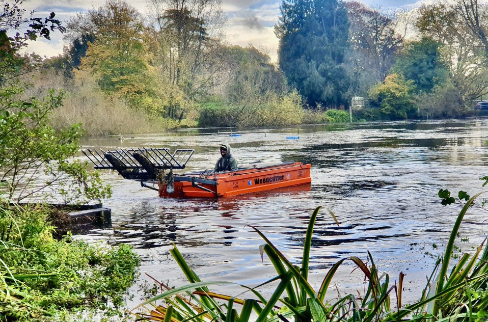 WeedCutter Ltd began working on October 26th to remove surface and rooted weed. They arrived from Chelmsford before 8:00 am. Ross the boat driver worked tirelessly the whole day and even removed large snags including, ropes, branches, trunks and an exterior door that may have been dumped from the Abbey ruins. The heavily studded hinges and metal frame suggested this. At this point I will publicly thank 3 members in particular. Prof Moriarty and Roland Palmer toiled for the whole day and Luke Martin who also worked alongside them. They barrowed the weed and snags from where it was dumped on swims to the perimeter bushes. The Club thanks them for their hard work and club spirit.